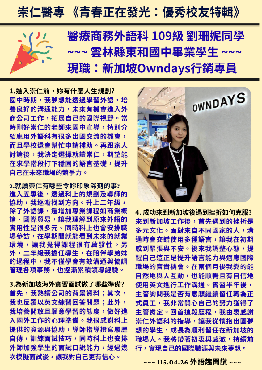 📣📣📣 109級應屆畢業生劉珊妮 從懷抱語言夢想,到走向國際職場; 勇敢跨出舒適圈,將努力進行到底。 接受挑戰,調整步伐持續前進; 一步步走向自己最初的夢想 🌟🌟🌟
