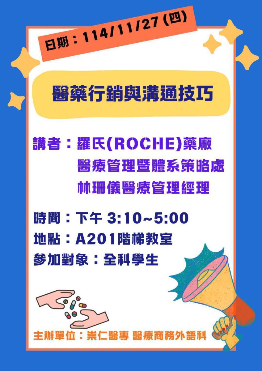 【應用外語科】11/27 (四) 職涯講座 - 醫藥行銷與溝通技巧