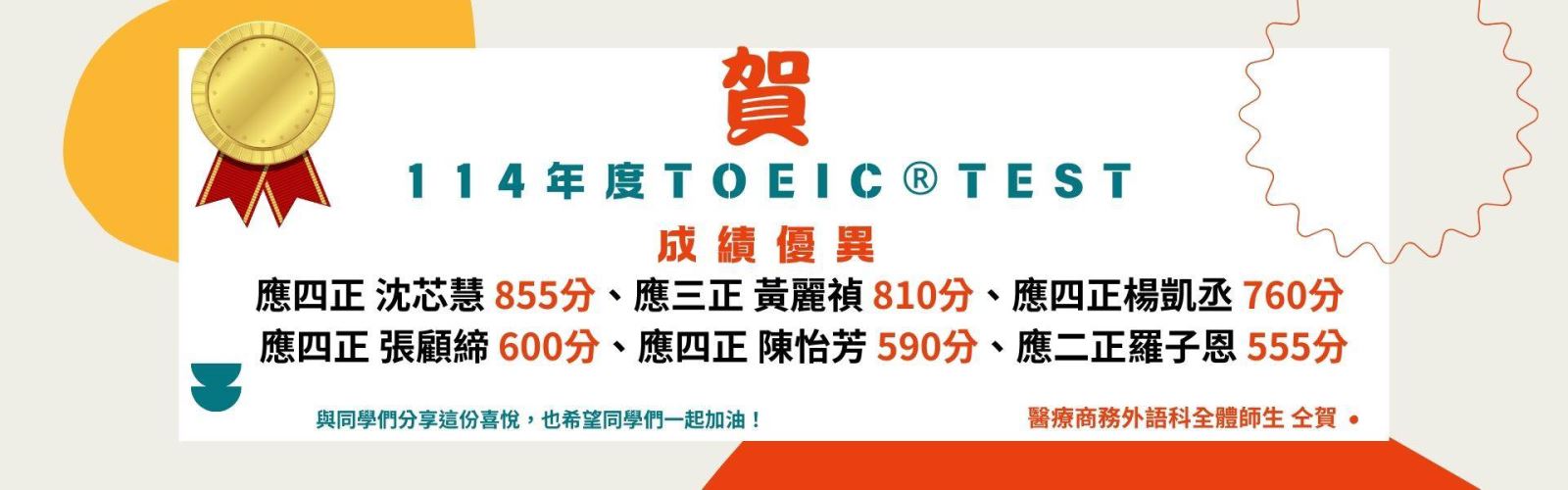 應四正 沈芯慧 855分 應三正 黃麗禛 810分 應四正 楊凱丞 760分 應四正 張顧諦 600分 應四正 陳怡芳 590分 應二正 羅子恩 555分