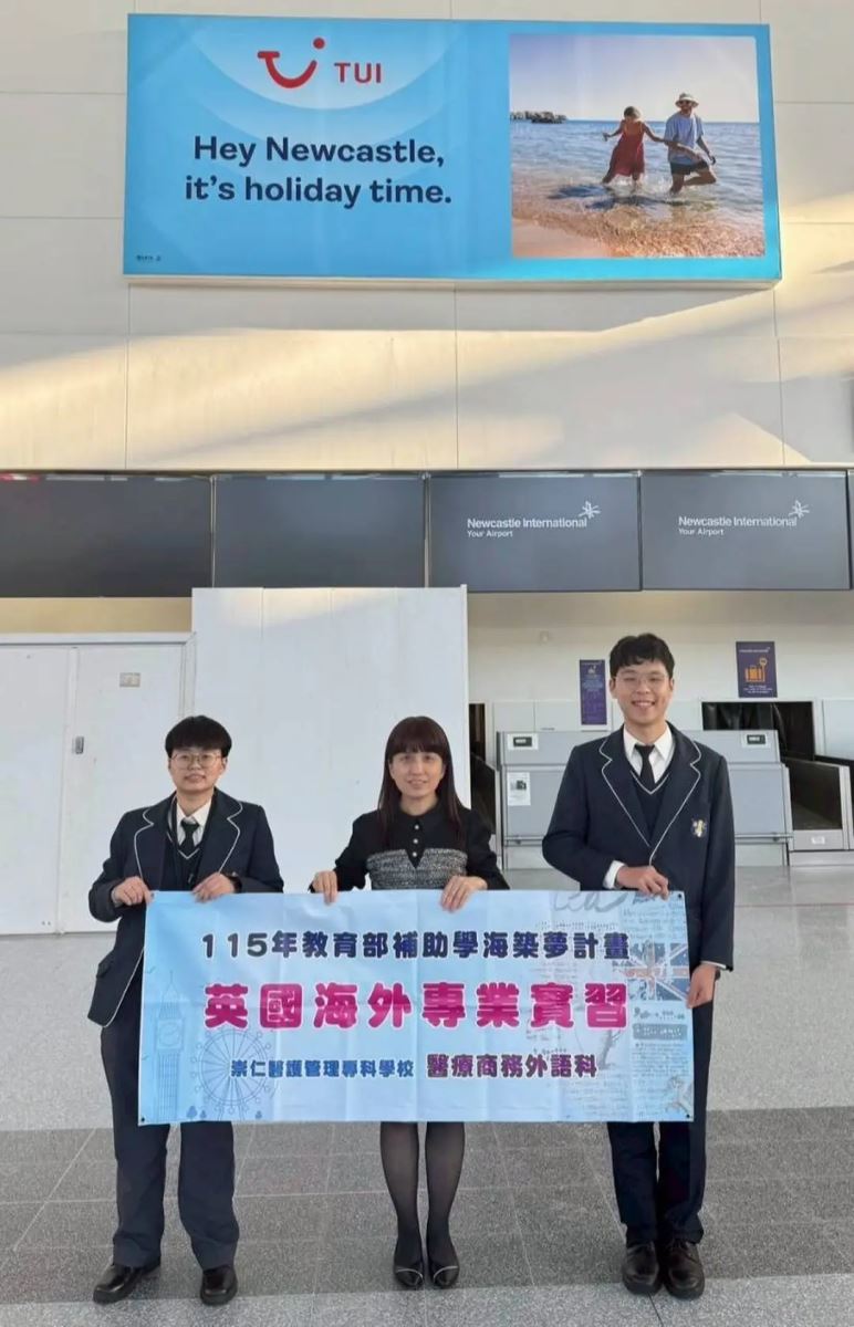 「115年教育部學海築夢英國實習」正式啟航!Part I #醫療商務外語科 四年級兩位優秀學生—沈芯慧同學、張顧諦同學,在邱筑瑤主任帶領下,於一月中自桃園機場啟程,跨越萬里,順利抵達英國 Newcastle,展開為期一個月的海外實習旅程。