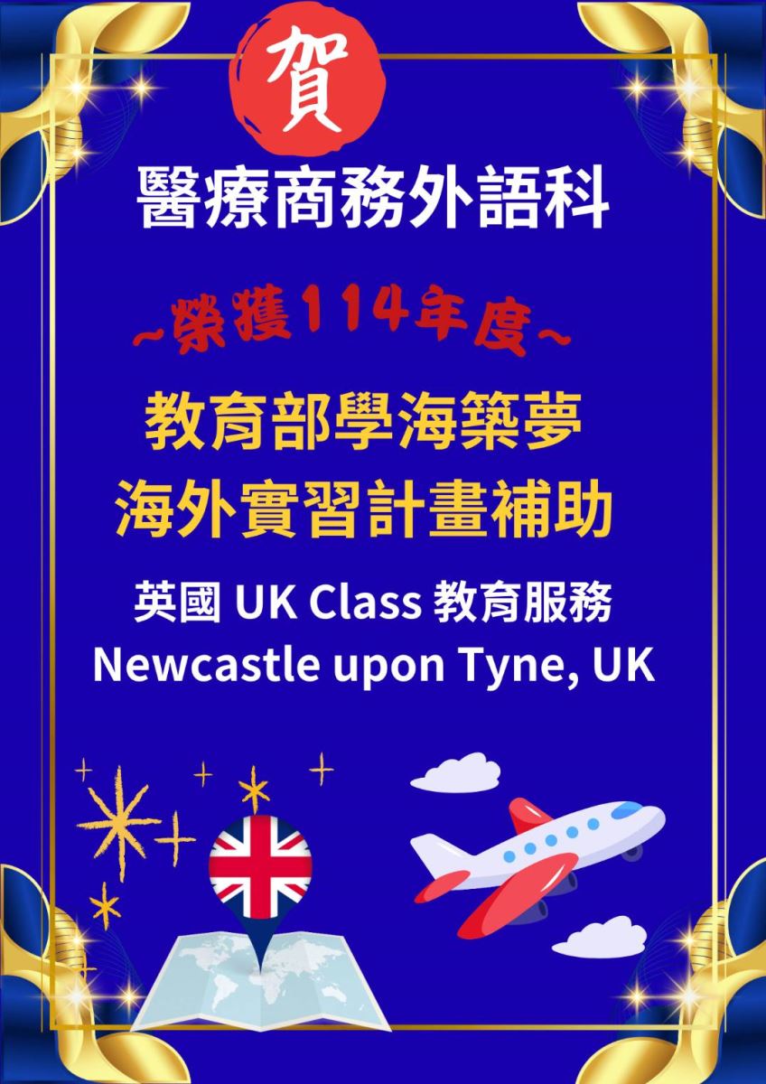 📣📣📣 好消息!#醫療商務外語科 今年再次獲得「教育部學海築夢」海外實習計畫全額補助。學生們將於寒假啟程前往英國,展開為期一個月的海外專業實習 👏👏👏